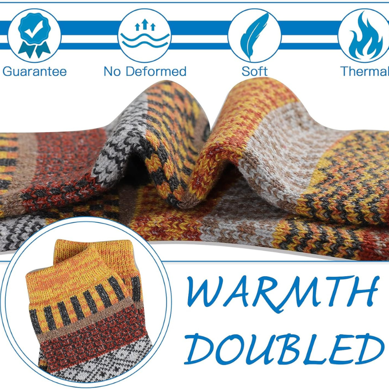 The 5 Pairs Designed Crew Heated Socks are crafted from a blend of polyester, wool, cotton, and spandex, offering softness, flexibility, and warmth. These machine-washable socks feature vibrant multicolored patterns for a stylish touch, paired with an elastic cuff to ensure a secure fit that prevents slipping. The seamless toe construction eliminates irritation, making them comfortable for extended wear, while the Y-shaped heel enhances fit and stability. Ideal for casual outings or outdoor activities, these socks combine style, support, and comfort to suit various weather conditions and occasions.