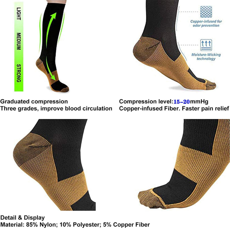The Pack of 8 Running Compression Socks is made from a blend of 85% nylon, 10% polyester, and 5% copper fiber, offering stretchability and moisture-wicking properties for all-day comfort. These socks are designed to support athletic and casual needs, making them suitable for running, workouts, travel, or extended periods of standing. Easy to maintain with machine washing, this versatile pack provides functionality and comfort for an active lifestyle.